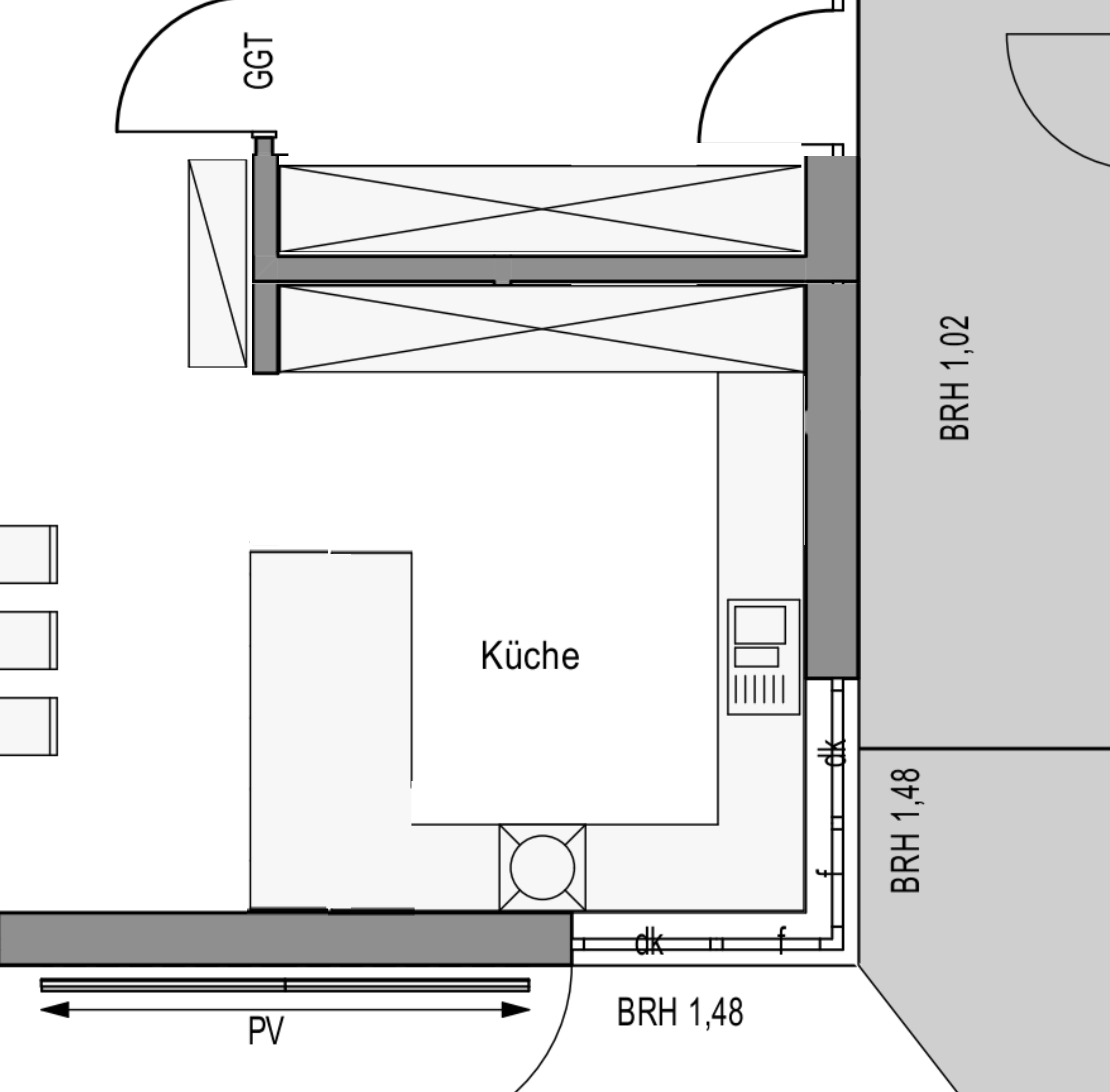 Das Einsparen der Tür würde Dir dafür ordentlich Platz schaffen, die seltener genutzten Geräte in der Küche zu verstauen. Für den Rest (bis auf die Tiefkühltruhe) ist ein Abstellraum oder eine Schranklösung in einem Flur praktischer - willst Du wirklich immer durch die Küche laufen um an den Staubsauger zu gelangen oder etwas Werkzeug zu holen? Bleibt die Tiefkühltruke - ein klassisches Keller- oder Garagengerät - solange man auch etwas Einfrier-Raum im Küchenkühli hat.Also wäre deine Lösung die Speis komplett zu streichen und den Platz für die Küche zu verwenden? Das wäre dann ein riesen Raum und dadurch würde die Küche sicher auch wahnsinnig teuer werden. Ich mache mir mal nochmal Gedanken darüber was genau dort rein kommt.Schau mal, noch eine andere Idee: So hättest du genauso viel Hochschränke wie vorher (im Flur für Garderobe, Staubsauger und Co.) und trotzdem eine tolle große Küche. Am Küchentresen beidseitig Schränke, 120 cm tief. Würde auch noch die Fenster in der Küche verbreitern. Diese komische kleine Einbuchtung hinter der Windfangtür (nur auf 3D Bildern zu sehen), würde ich dem Flur zuschlagen, also die Tür versetzen.