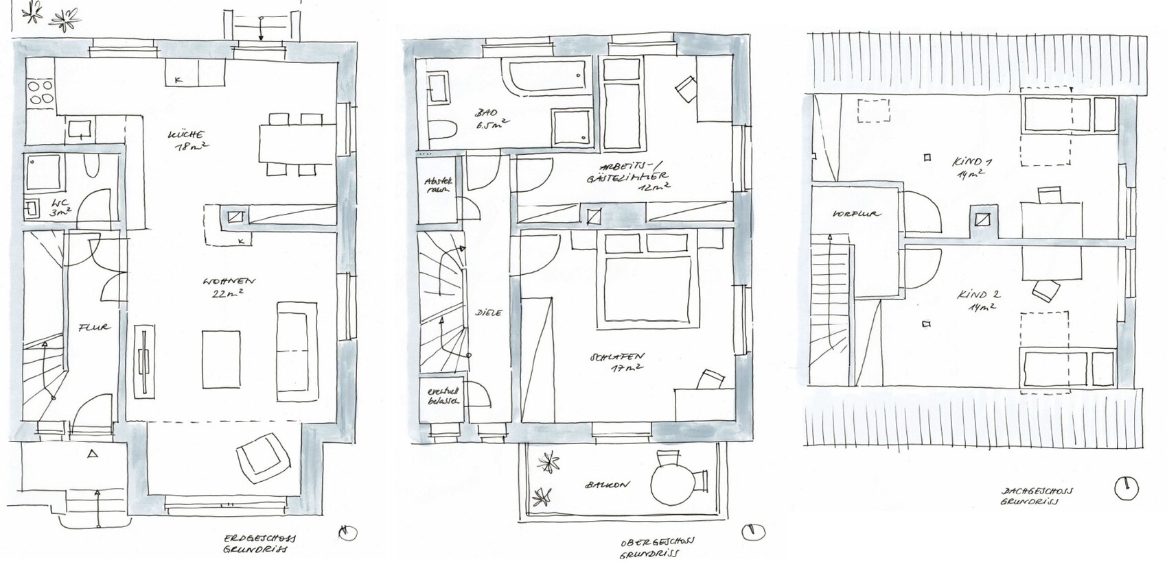 So, der erste Entwurf der lokal erfahrenen Architektin (leider ohne Maße). Irgendwie bin ich noch nicht so ganz überzeugt (mit Ausnahme des DG)