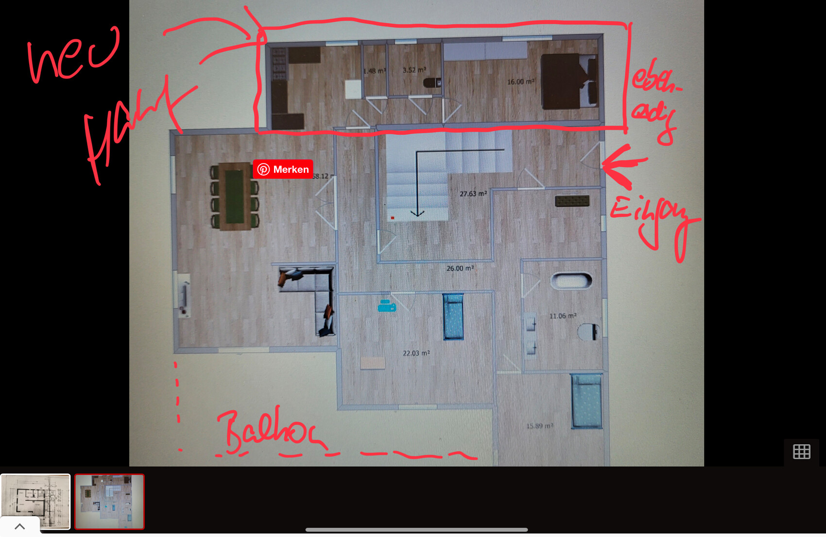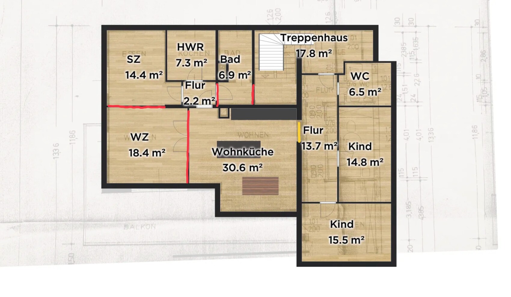 Planlinks habe ich die neuen Wände zusätzlich in rot markiert.