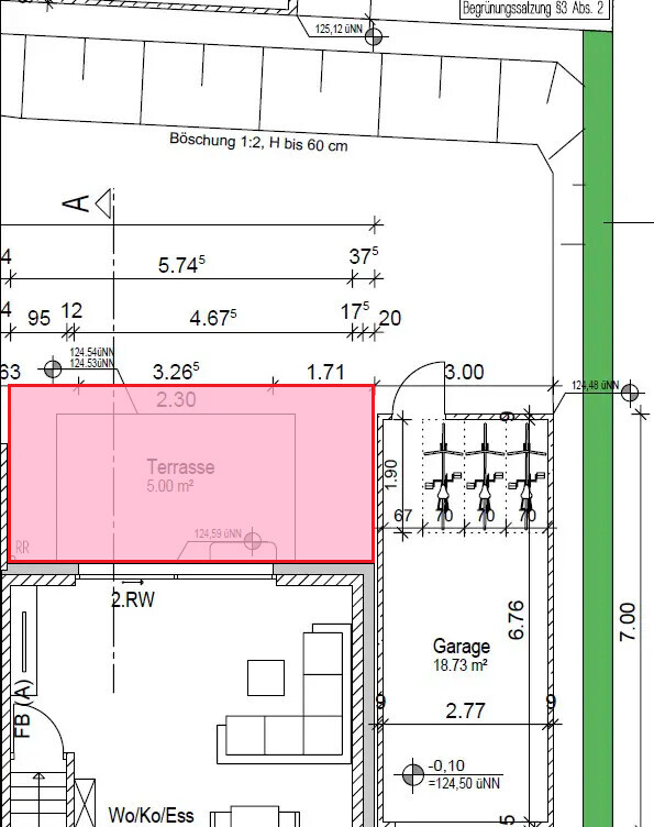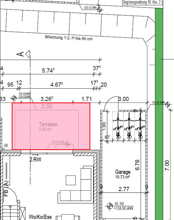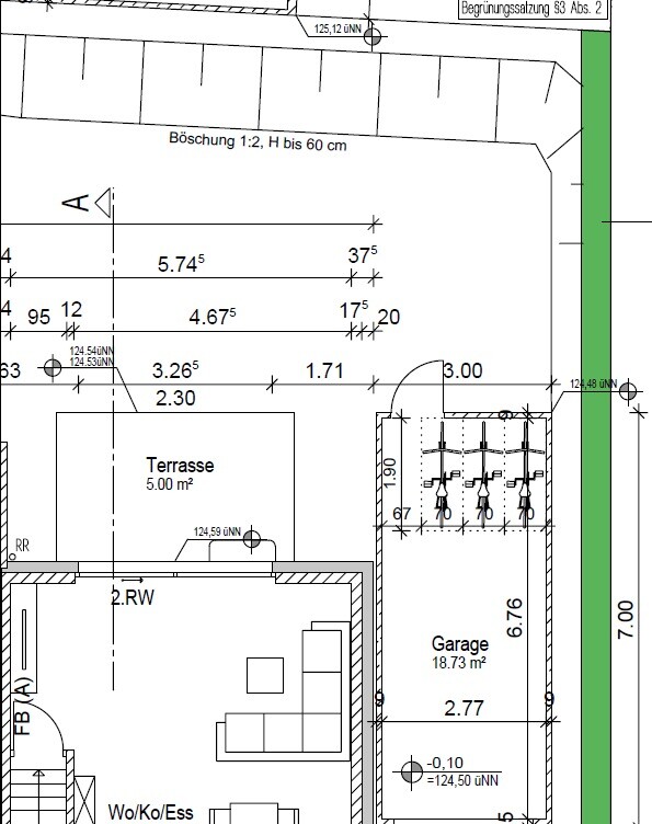 Ansonsten ist mein Gedanke zur Böschung so grob "ich glaube so in die Richtung, wie eingezeichnet macht schon Sinn und die dann bepflanzen". So ganz optimal dass der Garten "tiefer gelegt" ist und wir auf die Nachbargarage schauen, finde ich schon nicht, aber mit etwas Grünbepflanzung wird das denke ich schon.
