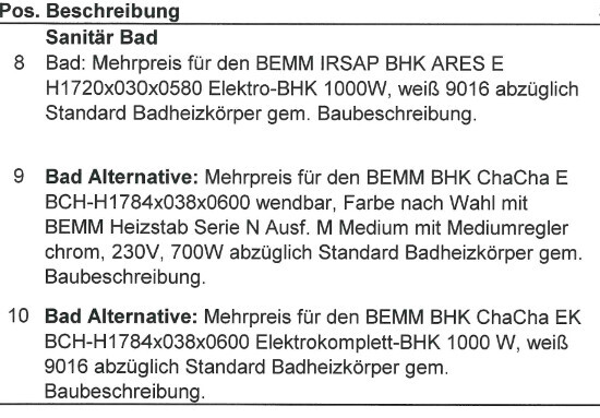 Das erste (die 8) war glaube ich einfach nur ein Fehler, das hat zumindest nichts mit dem zu tun, was wir angeschaut haben. Aber auch mit den anderen beiden bin ich etwas verwirrt, weil das zwei verschiedene Modelle sind (BEMM BHK ChaCha E und einmal Eigenkapital). Ich glaube, das kommt daher, dass es den Eigenkapital nur in weiß gibt und die Baddame uns beides (einmal weiß, einmal Farbe) anbieten wollte... aber die unterscheiden sich ja auch in der Technik? Wenn ich danach google, wird der Eigenkapital als "Betriebsart: Elektrokomplett, Reiner Elektrobetrieb" beschrieben und beim "E" steht "Betriebsart: Bivalenter Betrieb, Zentralheizung" (mit optinal Elektroset, was hier aber offensichtlich dabei ist). Im Standard war ein rein elektrischer Badheizkörper vorgesehen und vermutlich würde auch die Alternative so oder so rein elektrisch beschrieben. Dann ist die "9", also die für den bivalenten Betrieb, doch eigentlich Schwachsinn, oder? Ist auch fast doppelt so teuer (und ich glaube, wir haben mit weiß eh auch kein Problem). Aber ich dachte, das Forum kennt sich damit bestimmt super aus 😉