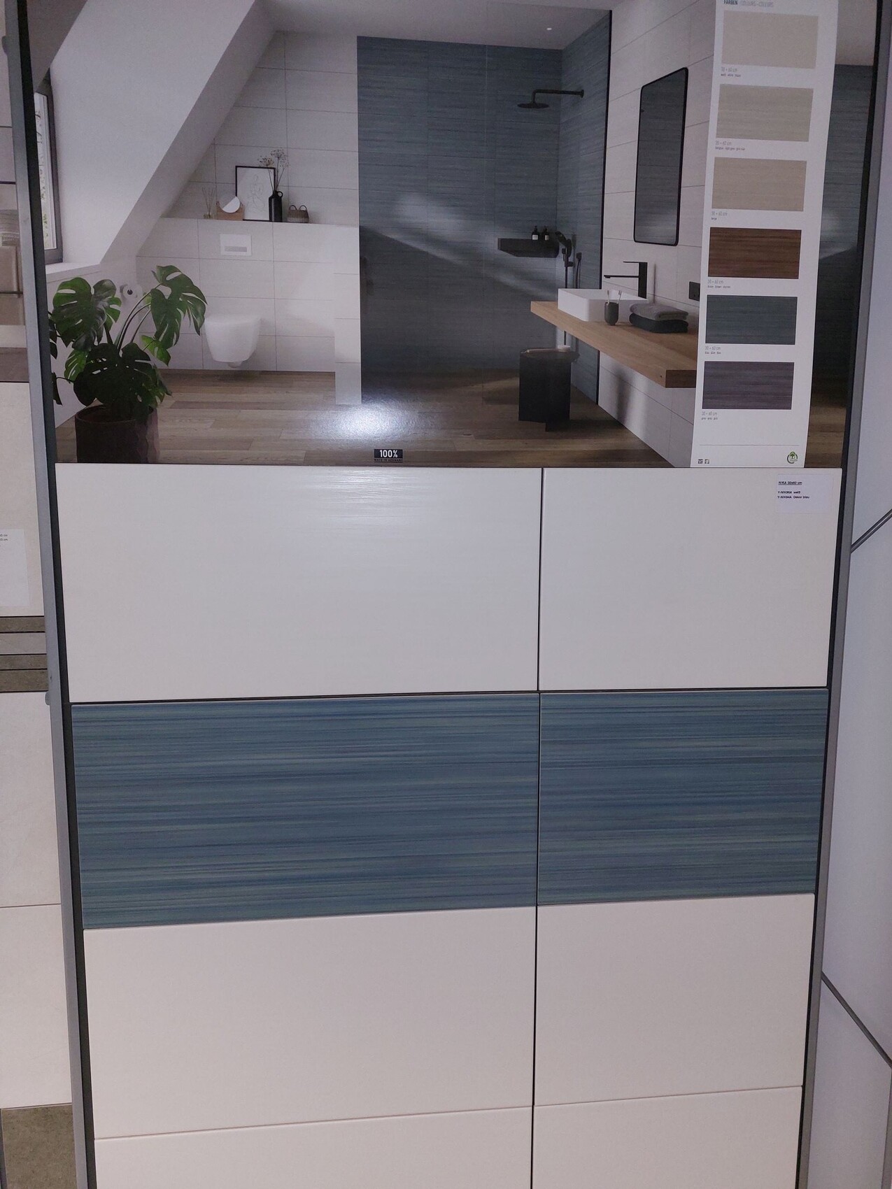 (Foto ist nicht von der 30x60-Variante und EIGENTLICH ist die Dekorfliese nen verwaschenes Jeansblau und nicht grau....mein Handy hat da echt krass verfälscht) Also äh Foto unbrauchbar.