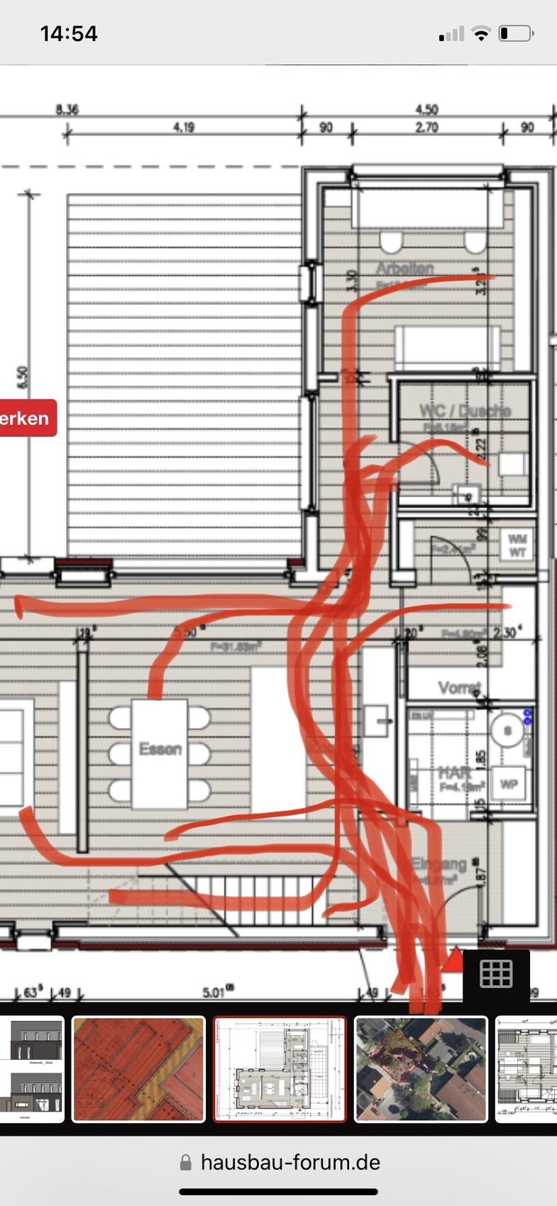 Ebenfalls würde ich das Haus innen anders anordnen. Die Küche kommt an das Hausende, wo jetzt das Arbeitszimmer ist; anschliessend Essen; auf die andere Hausseite hin das Wo-Zi und das Arbeitszimmer mit Bad. - Hauseingang dann von Osten - vom Carport her - Gartenraum kommt in die Nordostecke des GrundstücksSo einfach drehen geht es nicht da der Giebel ja eine bestimme Ausrichtung haben muss. Müsste man also ziemlich neu planen Garten zur Straße schließe ich aus - dann lieber keine Sonne auf der gesamten Terrasse. Eigentlich find ich die Ausrichtung fast gut. Aktuell haben wir Südausrichtung was dazu führt, dass man den gnazen Tag im dunkeln sitzt da die Rollladen halb runter sind (könnte man sicher über Raffstores besser lösen). dem Rest kann ich dann nicht mehr ganz folgen.