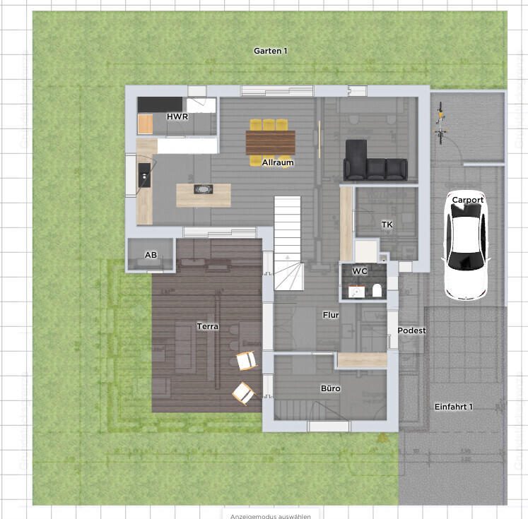 Grundriss eines Hauses mit Garten, Terrasse, Allraum, Büro, Flur, WC, HWR, TK, Carport