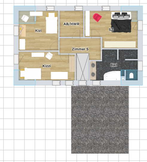 Ich habe mal rumgespielt. QM Grundfläche passt so zum Ursprung... Möbel dienen der Größenordnung, , Garderobe 200, Kleiderschrank 300 Tisch 200 x 100... Türen habe ich , obwohl ich nichts davon halte, hinter Schränke versteckt (wie es jetzt jeder haben möchte 😉)