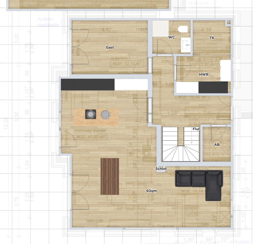 Im DG ist es super, dass beide KZ im Süden sind, an den Proportionen feil ich da auch gern nochmal herum. Tausch AZ und Schlafzimmer auch interessant, allerdings besteht mein Mann auf sein Arbeitzimmer in der Gaube. Am DG können wir mit neuer Treppenposition aber nochmal andere Überlegungen treffen und schauen ob es uns dann besser gefällt.