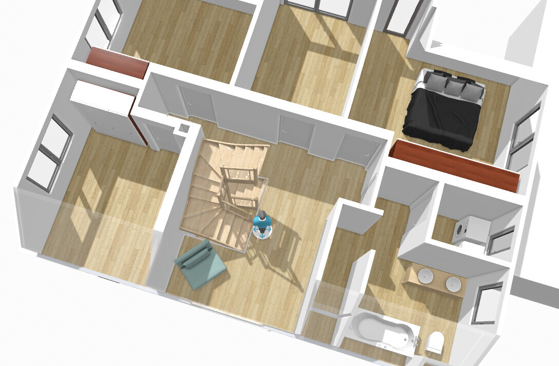 Treppe ins DG ist über der Haupttreppe, und der Fensterplatz ist gesichert. Schrank hat 3 Meter, die der Kids 1,50