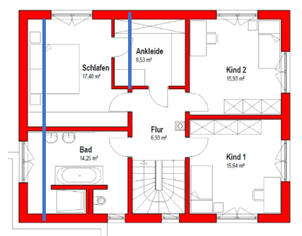Die blaue Linien sind nur grob eingezeichnet aber ich denke auch dass man dann hier ansetzten kann und dass Haus kürzen kann. Dem Bad kann man gut noch ein paar qm klauen . Vielleicht dann auch keine T-Lösung die nehmen meines Wissens nach mehr Platz ein.