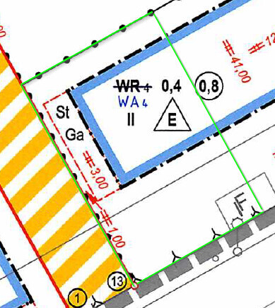 Der grüne Kasten wird etwa das Grundstück sein, nördlich und östlich sind Nachbargrundstücke, westlich und südlich Straßen. Der blaue Kasten die überbaubare Grundstücksfläche. Der rote Kasten St/Ga darf ausschließlich mit Stellplätzen oder Garagen bebaut werden. Da sieht man auch den Meter.