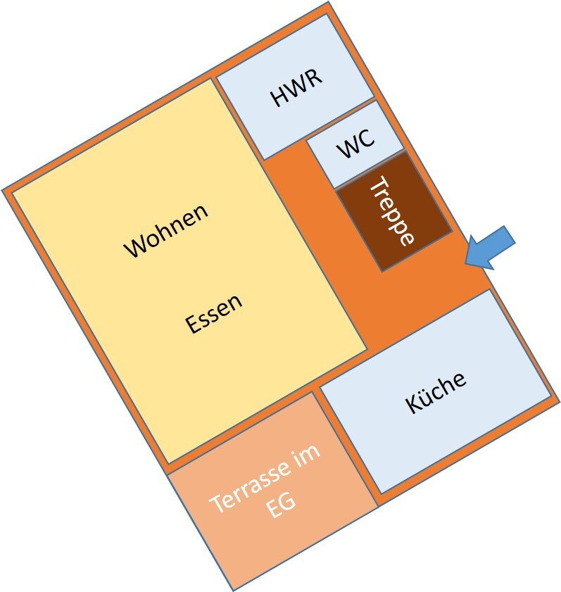 Das wäre grob meine erste Grundrissidee EG für dieses Grundstück, Treppe halbgewendelt. Die Terrasse muss so ja nicht sein (machts teurer), aber würde eine schöne Südwestausrichtung und etwas mehr Abstand zur Grenze bieten, als nur die 4m (?) nach West-Süd-West.