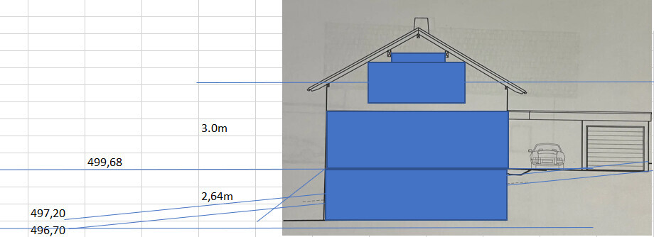 Ich hatte auch mal ermittelt wie es ist, wenn man das EG auf 500 m setzt. Dann hast ohne Keller sondern mit UG und EG immerhin noch reichlich Platz im Dach. siehe Kasten auf 2,0m und 2,5m