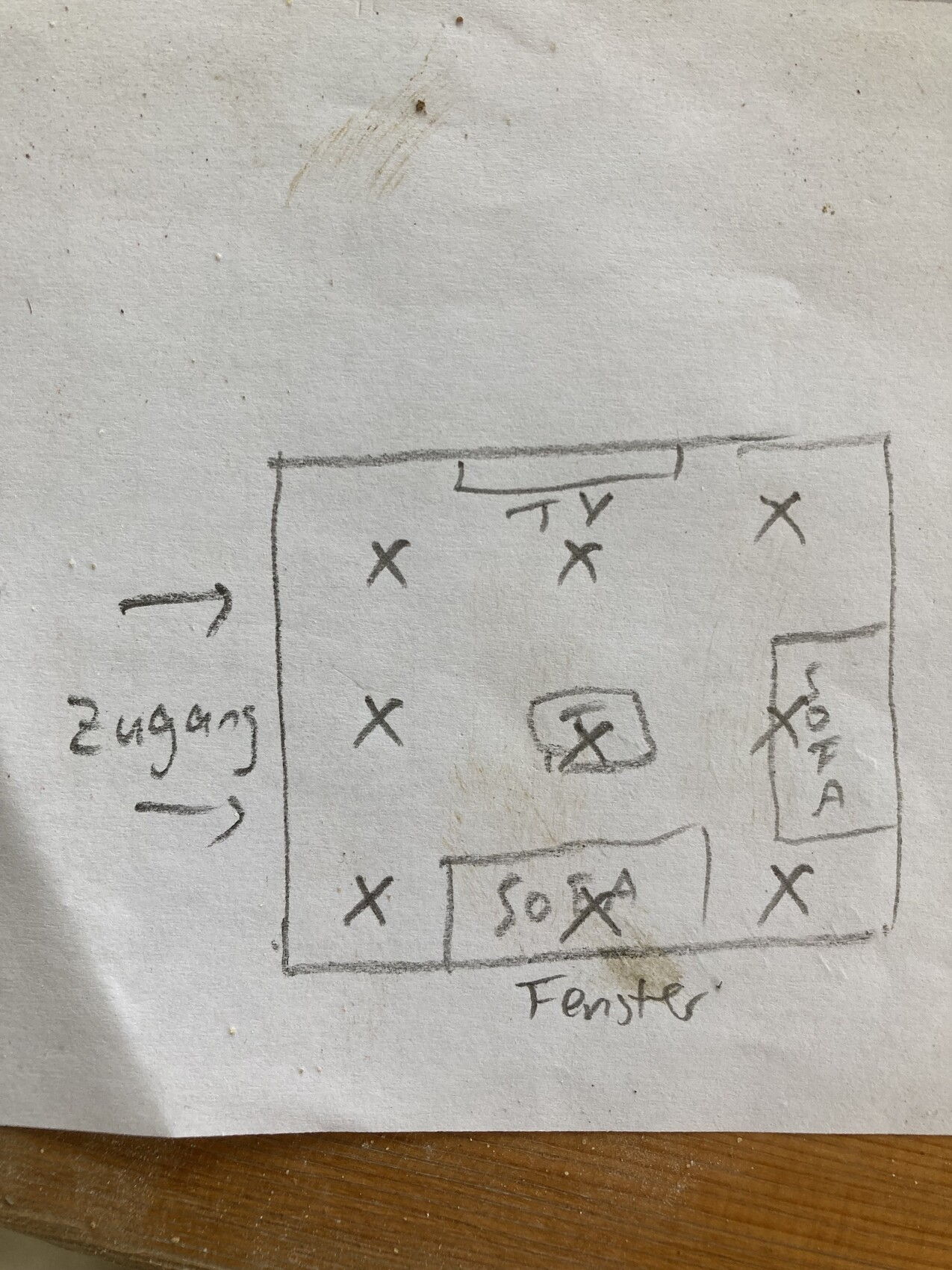 Wenn du dir das zutraust, leg es im Wohnzimmer 45° schräg von unten links nach oben rechts.