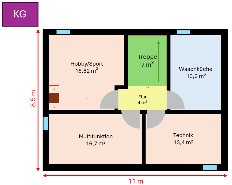 Grundriss Kellergeschoss mit Hobbyraum Waschküche Technik und Treppen