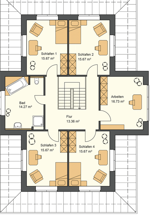 Das sind zu viele Räume/Ansprüche auf den qm, vor allem, wenn man ca. 40 qm Flur/Diele/Treppe/Luftraum hat. 5xSchlafen+2xBüro!