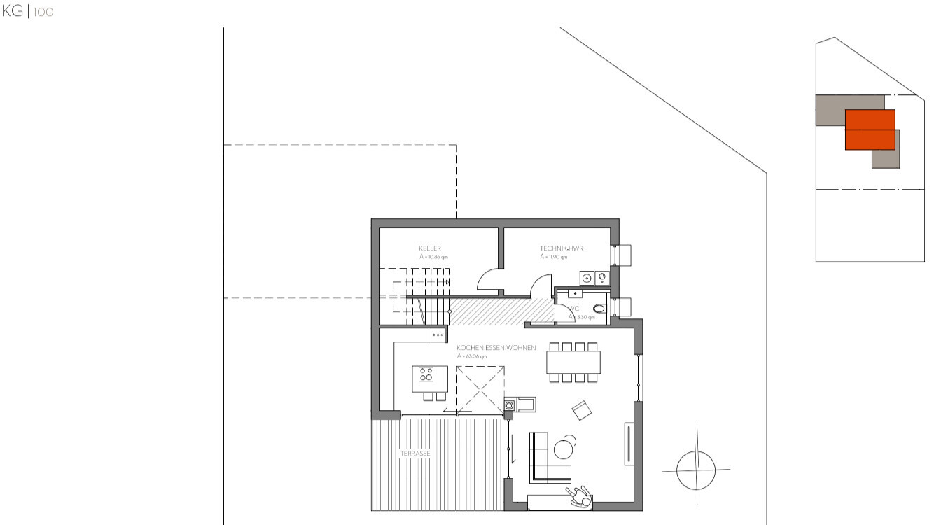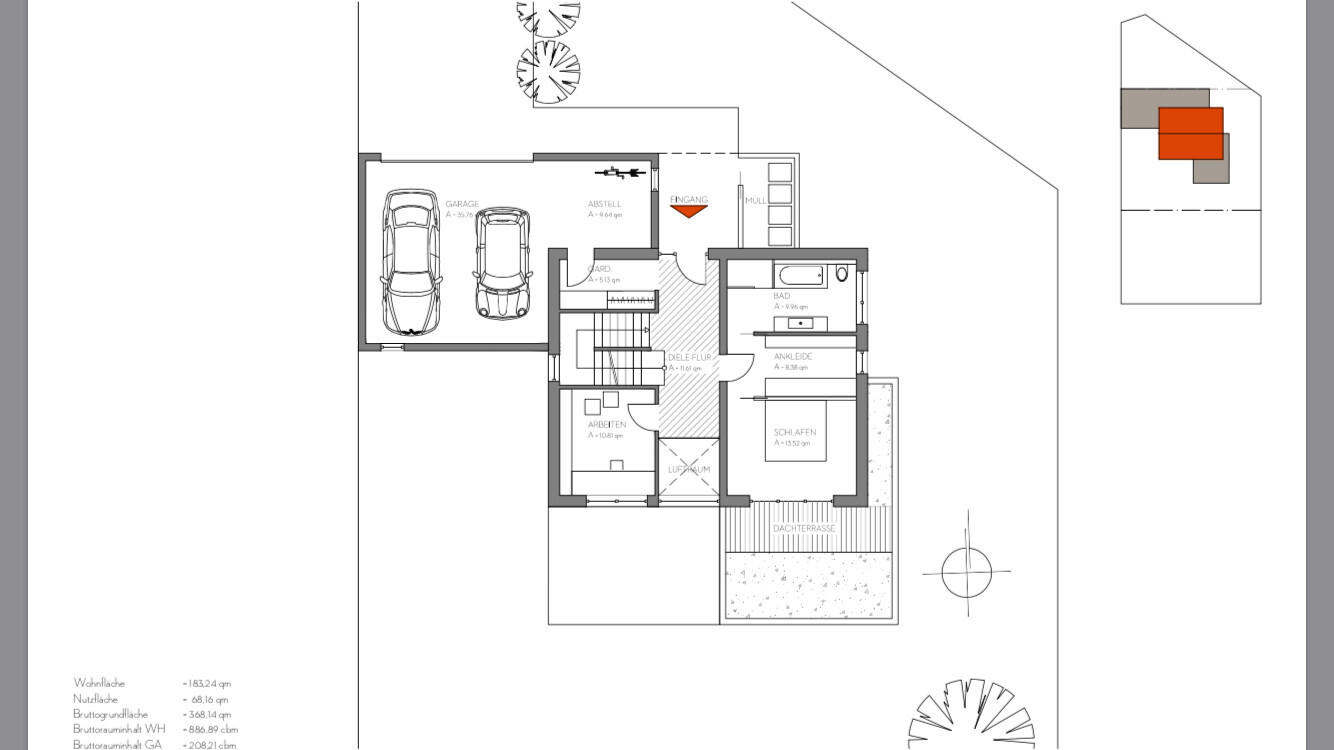 sind nun quasi fertig mit dem Entwurf - hier der entsprechende Plan. Dachterrassenzugang vom Flur ist nun einem Luftraum gewichen, um OG und KG „näher zusammenzubring“. Technikraum wandert nun in den linken/hinteren Kellerraum (im Entwurf noch nicht eingezeichnet).
