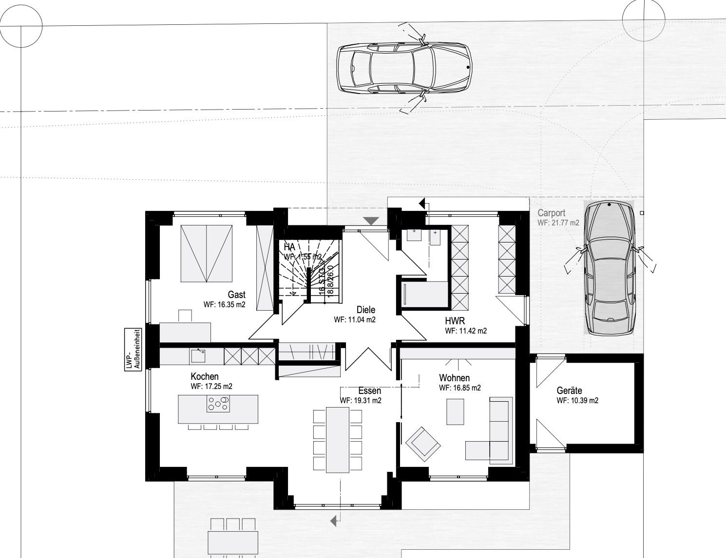 Grundriss eines Hauses von oben mit Küche, Essen, Wohnen, Gast, Diele, HWR, Carport.