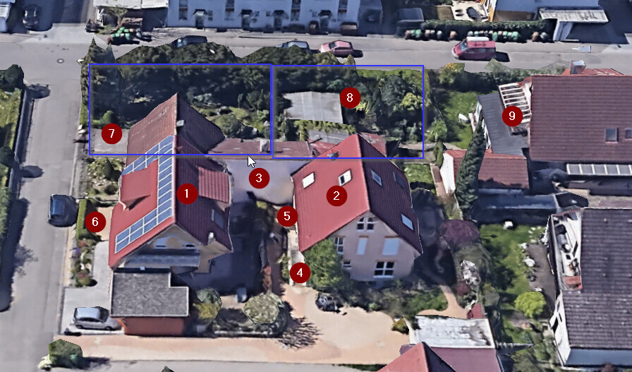 1+2: Nachbarhäuser an die passend angebaut werden muss. Häuser müssen angeglichen sein