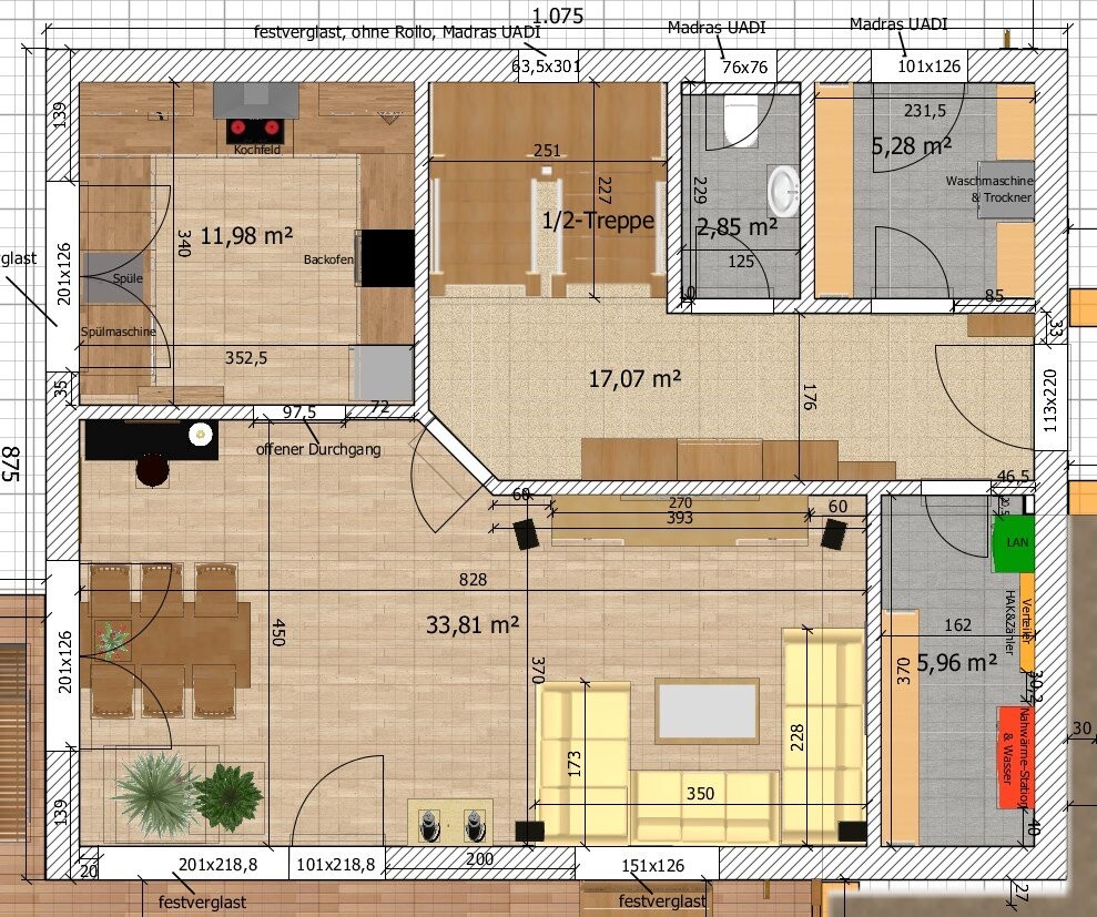 Edit: Wird glaub nichts. Bei der jetzigen Treppe hat an der jetzigen Position vom Bad kein anderer Raum Platz, insbesondere nicht das Schlafzimmer. Die Treppe müsste dann also wieder 1/4 gewendelt auf die Hauseingangsseite. Dann fehlt uns allerdings Platz für eine Garderobe, da das Haus nicht mehr als 8,74m Tiefe bekommen sollte. Alles net so einfach [emoji6] Find Schlafzimmer im Süden aber gar net so arg schlimm. Im Sommer kommt da keine Abendsonne mehr an. Badfenster im Nordosten bedeutet zumindest Morgensonne kommt rein - nur leider von hinten, wenn man vor dem Spiegel steht.