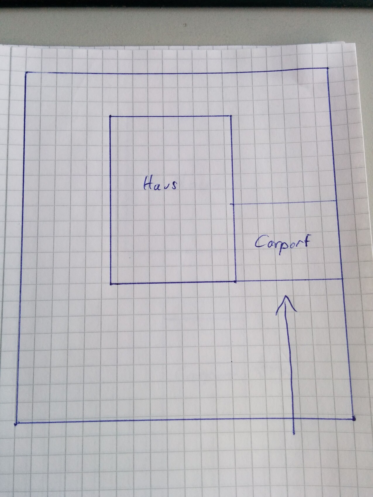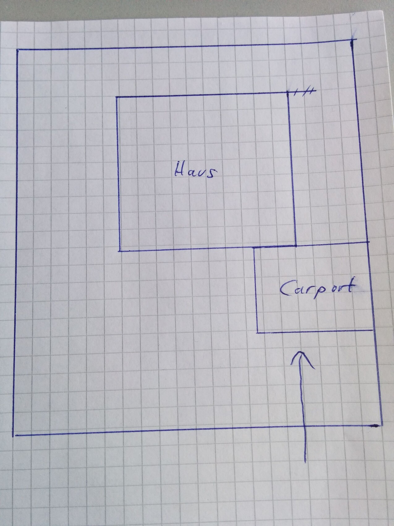 Steht der Carport unten (Südosten), wird er evtl. etwas tiefer stehen als das Haus, was mir besser erscheint als andersrum.