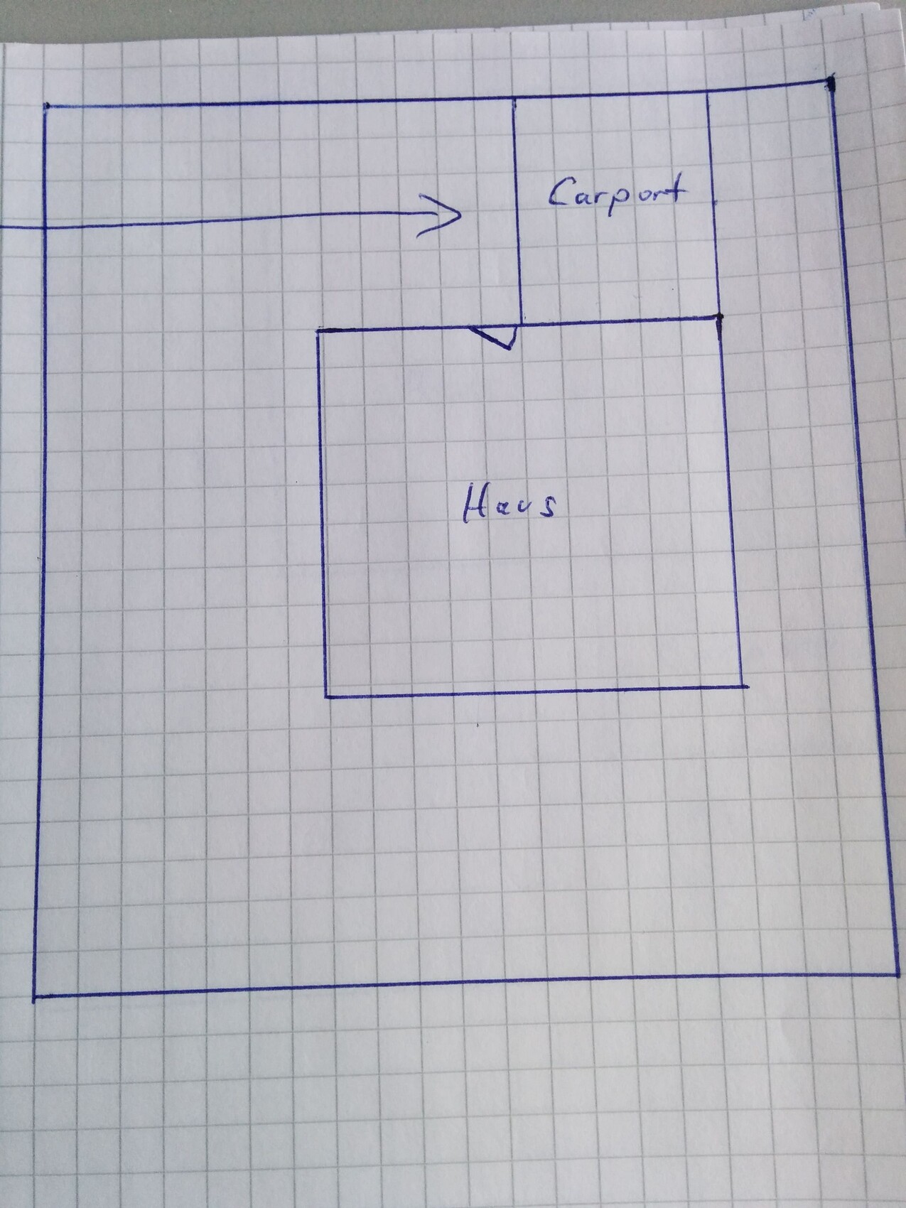 Grundriss-Skizze: äußeres Rechteck, innerer Hausbereich mit Carport rechts oben; Pfeil zeigt Carport.