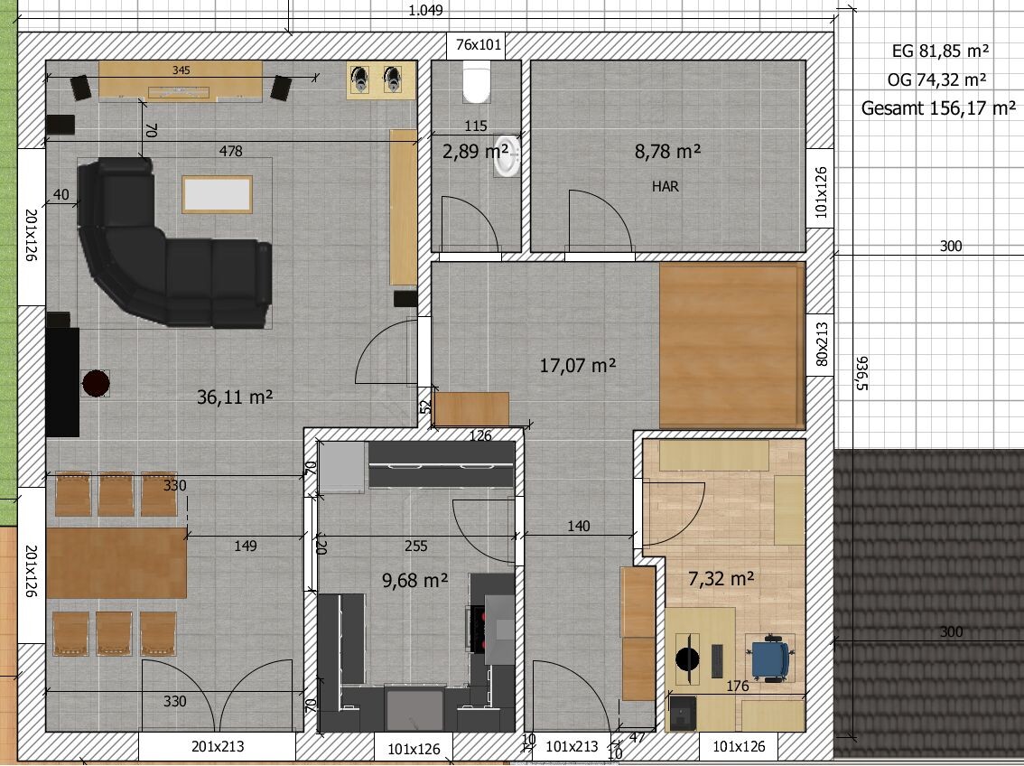 Viel Flur stimmt leider, ich seh nur keine Chance da einzusparen, sofern man sich darin noch bewegen können möchte. Das ist vielleicht den vielen Räumen im EG (und unserer recht großen Garderobe) geschuldet.