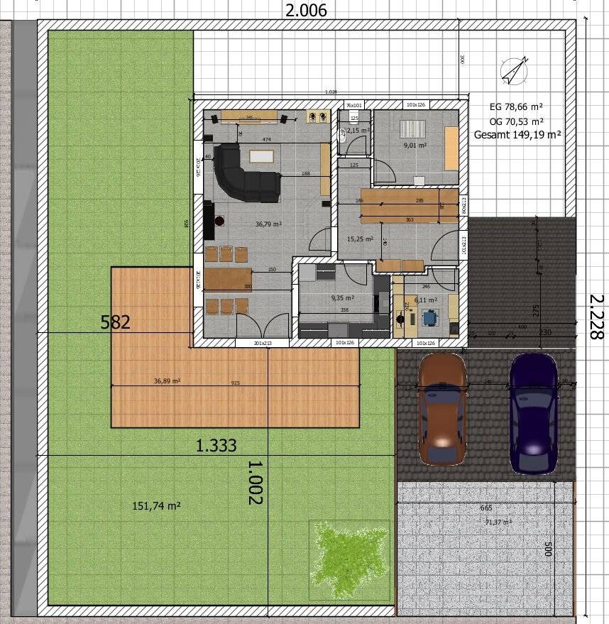 Die Elternankleide ist in beiden Varianten eher unbrauchbar. 60 cm vorm Schrank bieten nicht viel Bewegungsfreiheit und am Schlafenden muss man auch immer vorbei.Dass man durch den Carport muss, war ja genau mein Bedenken bei dem Grundriss mit Carport unten. Bei dem anderen find ich es sogar gut, dass der Eingang mit unter dem Dach des Carports liegt, ohne versteckt zu sein. Natürlich wäre uns ein größeres Grundstück mit Zugang von Norden lieber, da ginge das ohne Probleme - aber das ist nun bereits gekauft und bisher fehlt eine bessere Idee. Hier noch mal mit Maßen...