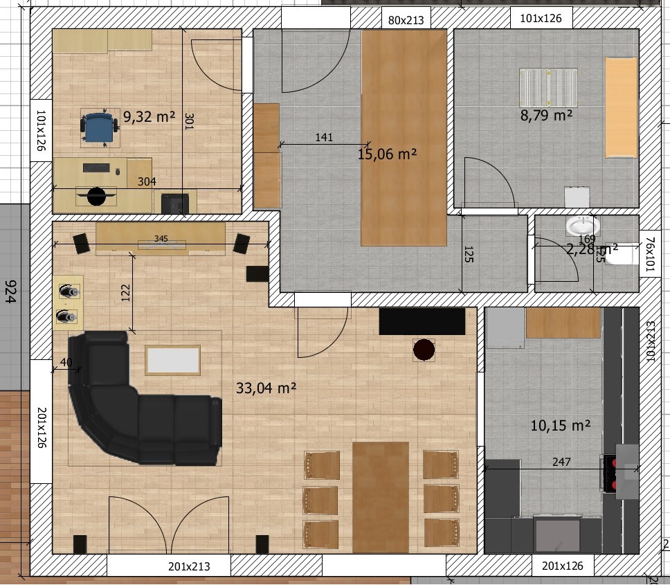 Was das Arbeitszimmer angeht: ich kenne Leute, für die bedeutet "Homeoffice", mit dem Laptop auf dem sofa oder auf der Terrasse zu sitzen. Wenn die Gattin dann zur Abendbrotzeit im Wohnzimmer kein Arbeitszeug mehr herumliegen sehen will, kommt es in ein Räumchen, wo man auch die Aktenordner lagert. Dieses Räumchen hat ein Fenster, so kann man es an Regentagen mal dort zu arbeiten aushalten, so ist es schön für das Finanzamt, das einen Sofa-Anteil als Arbeitszimmer ja nicht verstünde. Will man sich mit Kunden dort hinsetzen, reicht ein Kämmerchen natürlich nicht. Aber als "wenn Papa sich dort hinsetzt, dann bitte nicht stören" Zimmer genügt es auch mit der Größe wie im ersten Entwurf.