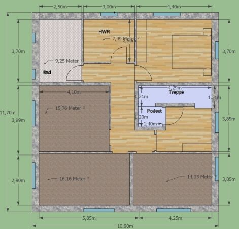 da muss ich erst mal drüber nachdenken, was Du meinst. Auf jeden Fall ist das natürlich totaler Blödsinn, was ich geschrieben hatte. Das ganze geht nur, wenn wir die Treppe umdrehen. Das hat den großen Vorteil, dass im Eingangsbereich mehr Platz ist. Ab davon ist die Treppe riesig und das Treppenhaus auch. Halte ich für Verschwendung. Daher würde ich wahrscheinlich versuchen mit einer 1/2 gewendelten Treppe zu arbeiten. Selbst bei großzügigen Stufen kommst Du da auf 3,5m Länge bei 1,3m Tiefe. Damit gewinnst Du enorm an Platz und das ganze muss völlig neu durchdacht werden.
