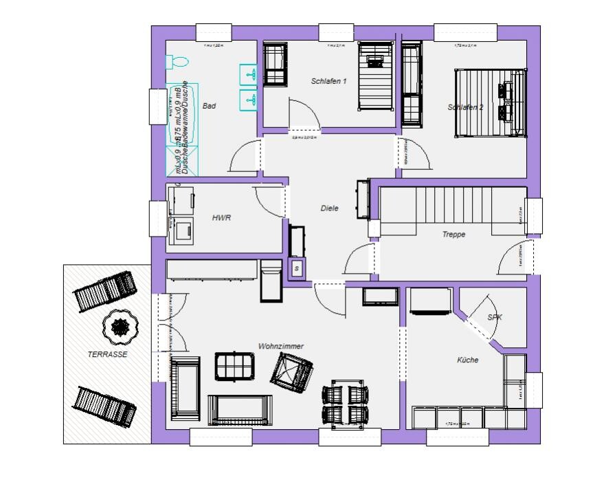 Der Schwachpunkt bleibt der Eingangsbereich der OG1, das sehe ich auch so. Wobei es eigentlich schon unten anfängt: Man kommt zum Haus rein und geht gleich neben der Hauseingangstüre die Treppe hoch, die zwar 1,1m breit ist, aber zwischen zwei Wänden verläuft. Vor der Wohnungstüre ist dann ein "mäßig großes" und relativ dunkles Podest. Und innen geht es weiter mit der krummen Wand.
