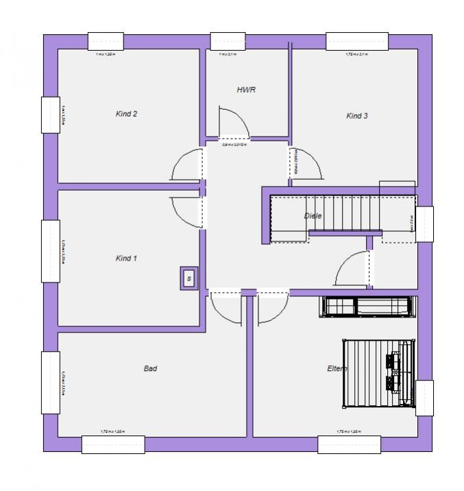 Die Kinderzimmer haben annähernd gleiche Größe, was für Frieden sorgen sollte. Das Bad hab ich daher vor gezogen, dann wecken die Eltern auch nicht gleich alle Kinder, wenn sie von Ihren nächtlichen Streifzügen ins Bett finden.