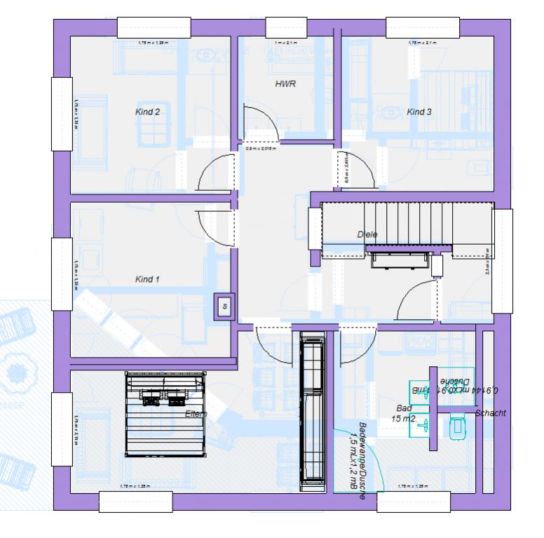 Jedenfalls könnte es so auch mit der alten OG1-Zimmer-Aufteilung funktionieren, die Kinderzimmer sind hier ebenfalls fast identisch und haben einen vernünftigen Zuschnitt (sind aufgrund der Türpositionen allerdings nicht so günstig einzurichten bzgl. Schrankposition).