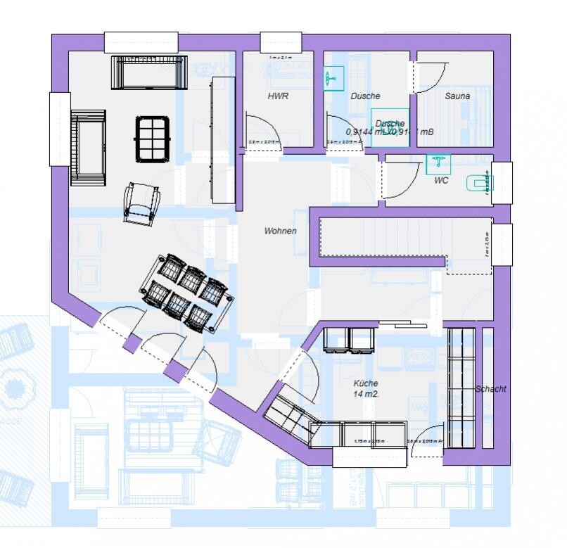 Dafür müsstest Du aber wahrscheinlich ein bissel von der Terrasse opfern, da sonst der Gang von der Treppe ins Wohnzimmer zu eng wird.
