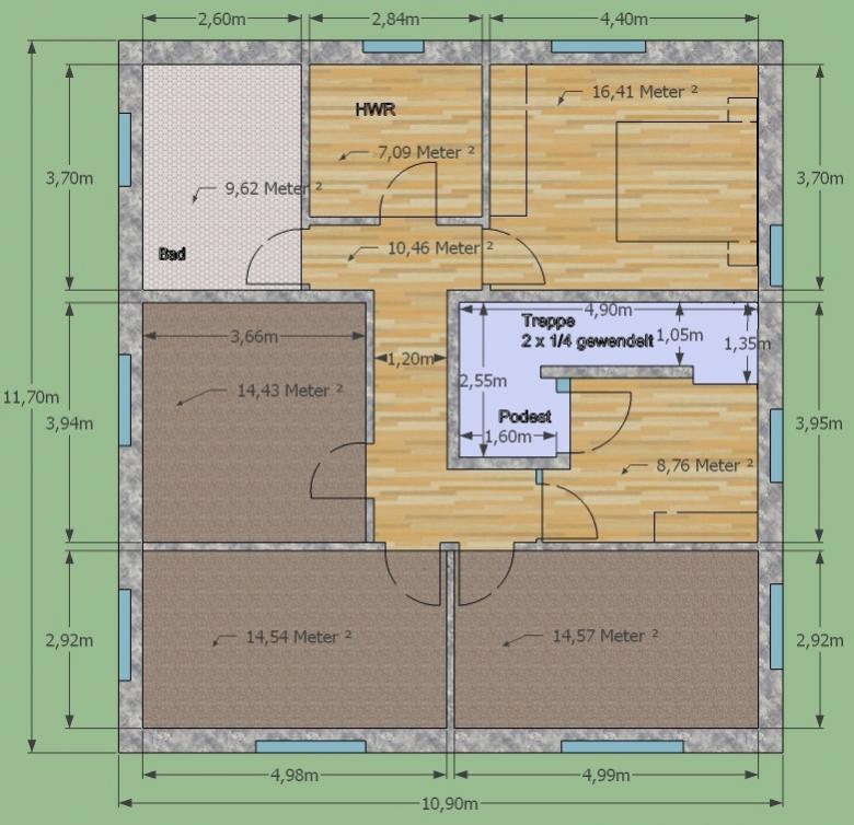 Ich habe auch mit einer ungespiegelten 2 x 1/4 gewendelten Treppe noch mal gespielt. Grund ist, dass mir unser altes OG2 schon noch einen Tick besser gefällt, aber das macht mit der gespiegelten Treppe wegen des langen Weges zur Küche keinen Sinn. Das OG1 sähe dann z.B. so aus: