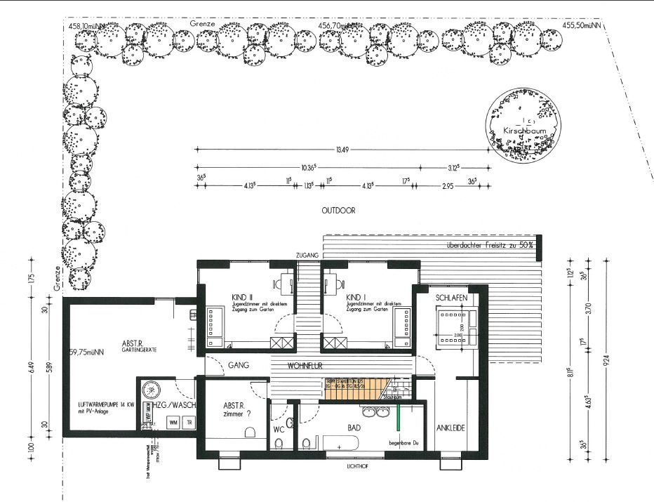 Auf Basis des bereits hier gezeigten Entwurfs (dieses Haus wurde vor drei Jahren umgesetzt) und unserer Wünsche (siehe ersten Beitrag in diesem Thread) entstand folgender erster Entwurf (Norden ist "links").