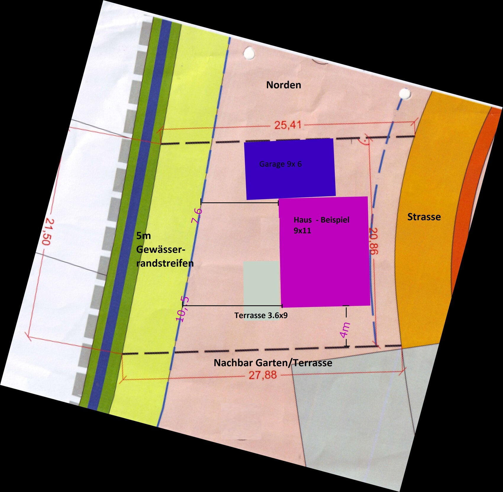 Du hast Recht...Skizze im Anhang. Bitte beachten!! Grundstücksskizze ist nun nach Norden ausgerichtet! Als Beispiel das 9x11 Haus eingezeichnet mit Doppelgarage 9x6.Mit der Doppelgarage (5.8m Breite) und 11m Haus bleiben 4m Richtung Süden.