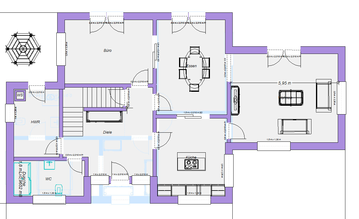 In Summe kein schlechter Entwurf. Ich beschäftige mich jetzt auch noch mal eingehend damit. Aber im EG gefällt mir Wohn- und Essbereich in der alten Form besser als die "Über-Eck-Lösung", auch wenn man da sicher noch eine Wand heraus nehmen kann.... quer denken ist trotzdem gut.Ist der Versuch, die Sonne ins WZ zu holen, denn die kommt m.W. von Plan rechts unten bzw. unten (abends). Für mich immer das A und O. Ohne Sonne ist alles düster.Wir knobeln weiter.
