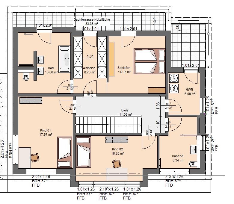 Unser Architekt hat den Wunsch mal aufgegriffen, zu versuchen, meine Gedankenskizze mal zu zeichnen. Findet er selbst auch gar nicht schlecht. Und die vorgeschlagene leichte Verkleinerung des Gebäudes ist damit gut zu realisieren. Bis auf die fehlende Kochinsel (und die kann vielleicht ja auch in die kleinere Küche rein) sehe ich erst mal keine Nachteile. Auch im OG nicht. Im Gegenteil. Das eine Kinderzimmer ist jetzt direkt mit der Tür ans Bad angebunden und der Hauswirtschaftsraum ist wieder größer....