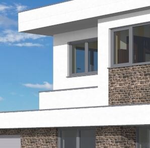 Die Alternative im Bauhausstil, die uns aufgezeigt wurde, gefällt uns dagegen absolut nicht. Riesige klotzige Wände, die auch mit Farbe abgesetzt nicht besser auf uns wirken.