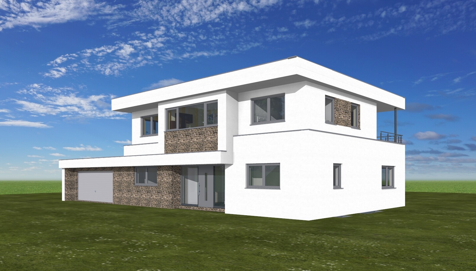 Die Alternative im Bauhausstil, die uns aufgezeigt wurde, gefällt uns dagegen absolut nicht. Riesige klotzige Wände, die auch mit Farbe abgesetzt nicht besser auf uns wirken.Nein, ein weißes Flachdachhaus mit grauen Flächen neben den Fenstern und rubinroten Erkern ist nicht Bauhaus, das ist Hornbach. Dein Lieblingsentwurf mit Bruchstein-Leoprint steht dem aber nicht nach, und klotzig sind da die Versätze.An einem „echten“ Bauhausstil-Haus kommt man mit Schattenkanten aus, die jeweils nur Sprünge von einem Viertelmeter in einer Dimension machen. Du schaffst hier innerhalb jeder Seitenansicht gleich zwei Handvoll solcher Profilierungen, mehrfach sogar zwei innerhalb weniger als einem Meter Abstand, und die Mehrheit springt gleich in drei Dimensionen (und findet am anderen Ende einer an sie grenzenden Linie ein Pendant mit anderen Maßen). Du wirst auf der Baustelle ungläubig alles nachmessen, wenn der Architekt Dir ernsthaft diese Überdosis baut. Auf dem Papier sieht das alles so viel harmloser aus. Und natürlich sind die Isokörbe, Abdichtungen und Unterzüge in der Summe so teuer wie ein zweiter Keller.
