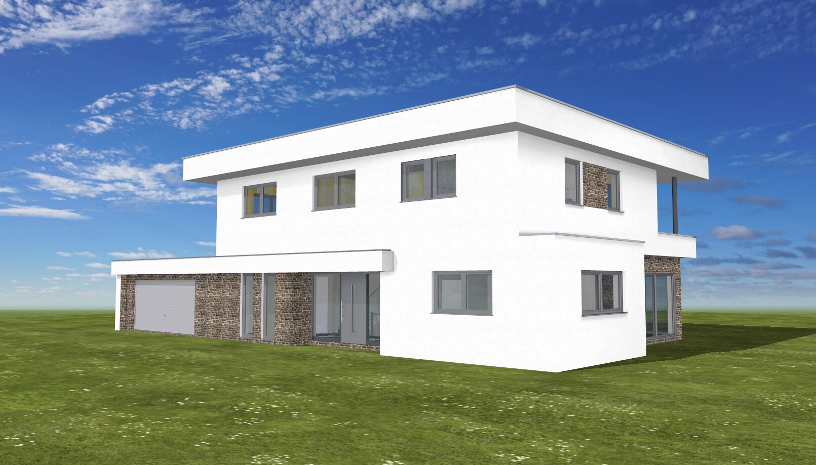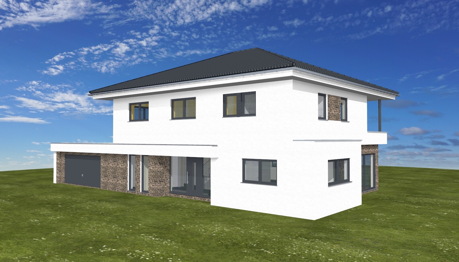 Dies ist ein Flachdachhaus mit Walmdach und nach wie vor zu dick aufgetragener Baukörper- und Fassadengliederung.