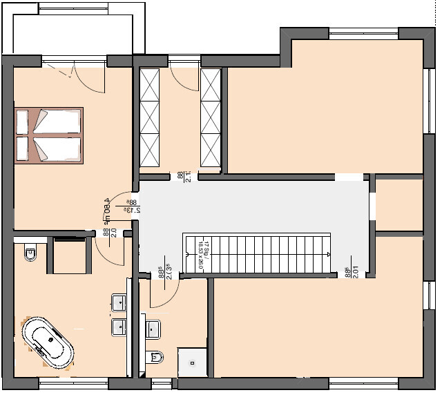 Das Schlafzimmer könnte über dem Büro und der Schleuse liegen, der Unterzug erlaubt die Fassade für einen Balkon einzuziehen. Dargestellt ist dabei eine gemauerte Brüstung mit Glaseinsatz über dem Fenster des Büros. Das Elternbad habe ich über die Küche gesetzt, und das Kinderbad daneben. Das Kämmerchen für die Waschmaschine ist nicht der Weisheit letzter Schluss, mehr ein Zwischenergebnis der Gedanken. Diesen Raum - wie vorher mit Platz zum Bügeln - über der Schleuse anzuordnen, wäre auch denkbar. Dann sogar mit Terrasse auf einem Teil des Garagendaches.