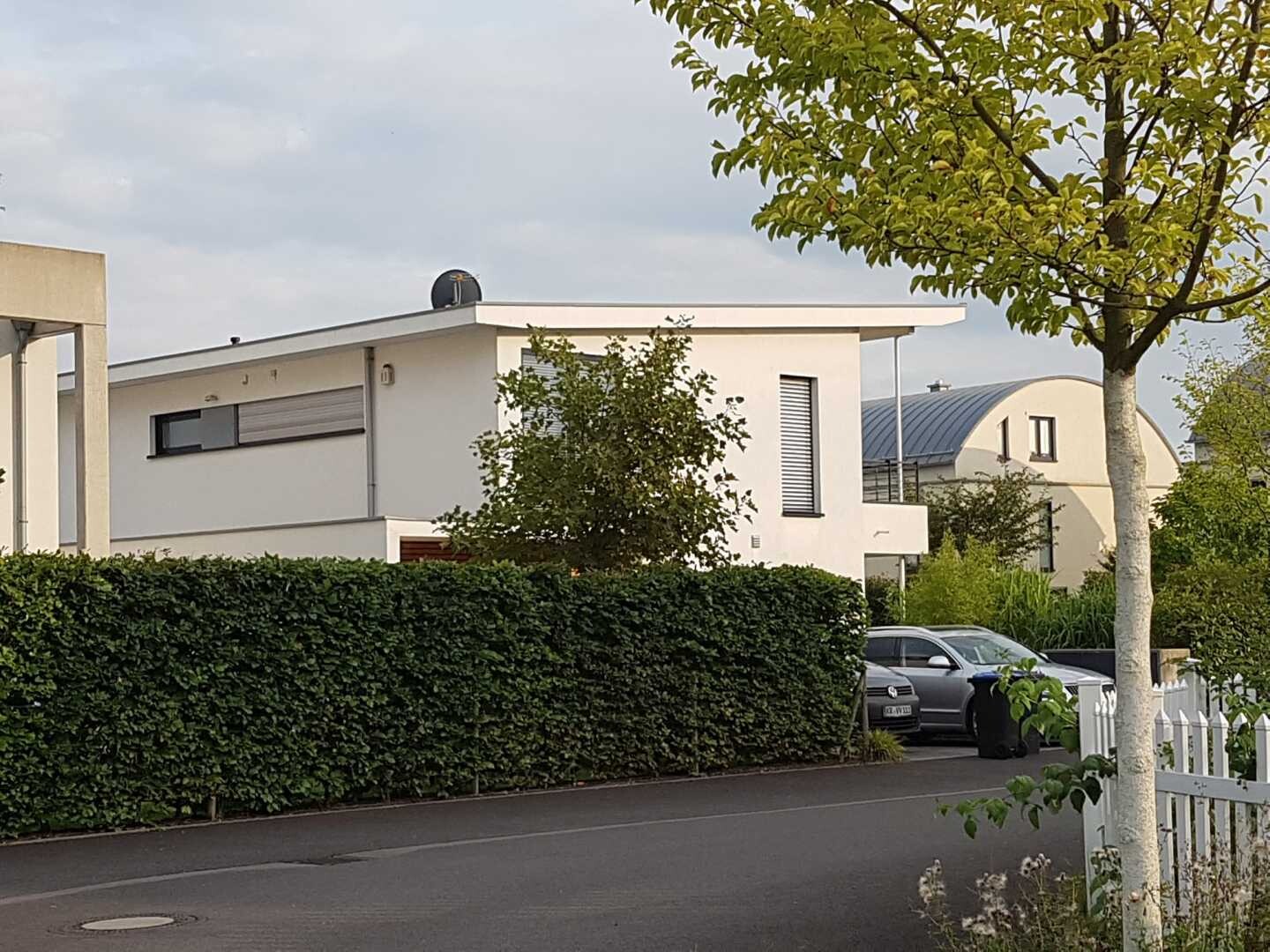 Die anderen beiden Häuser aus der Nachbarschaft habe ich jetzt wie angekündigt noch mal fotografiert. Ich persönlich könnte z. B. sehr gut mit einem Pultdach leben. In unserem Fall die höhere Seite dann zum Garten hin. Wobei ich nicht sicher bin, ob der aktuelle Entwurfsvorschlag überhaupt für ein Pultdach geeignet ist.