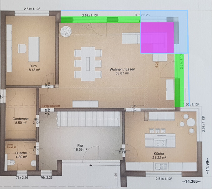 rosa: Flächenverlust für Wohnzimmer, wenn unten und oben gleicher Wandverlauf und Terrasse unter Balkon