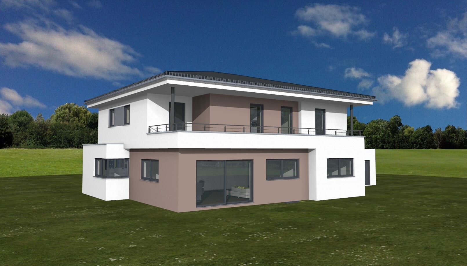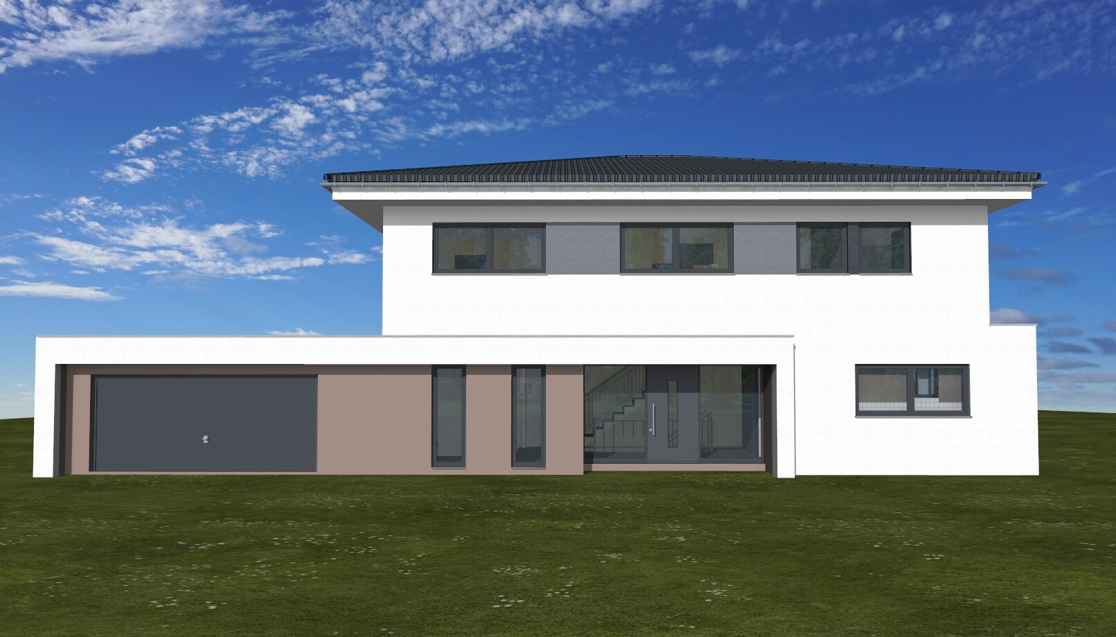 Das Flachdach wollte meine Frau nicht so gerne haben und mit dem flachen Walmdach können wir beide sehr gut leben. Von vorne steht es dem Haus auch besser. Von hinten würde ich sagen neutral ggü. dem Flachdach. Siehe Anlage.