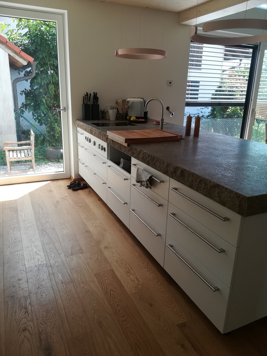 Ich häng mal ein paar Bilder unserer (immer noch nicht ganz fertigen) Küche an (die Bilder sind schon älter, aber man sieht, daß die Insel trotz dem fehlenden Fenster genug Licht bekommt), damit ihr seht, daß das Fenster an der Insel echt nicht notwendig ist (und der Fassade auf der Südseite tut es auf jeden Fall gut).