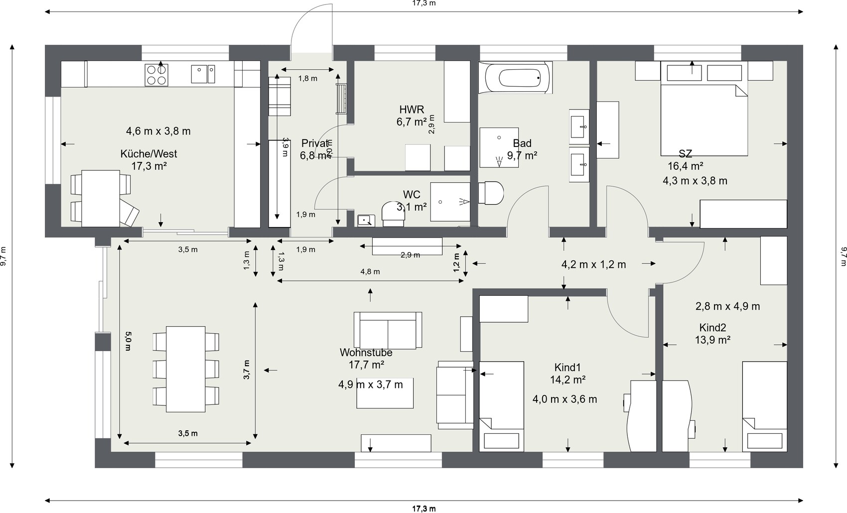 Nochmal ein Tipp: korrigiere mal die Möbel in normal verkäufliche Möbel: Deine Sofa haben Puppengrösse, bzw die mögen als Gästeklappsofa dienen, aber nicht als WZ-Möbel zum Wohlfühlen. Das gleiche mag ggf für die Küchensitzecke gelten