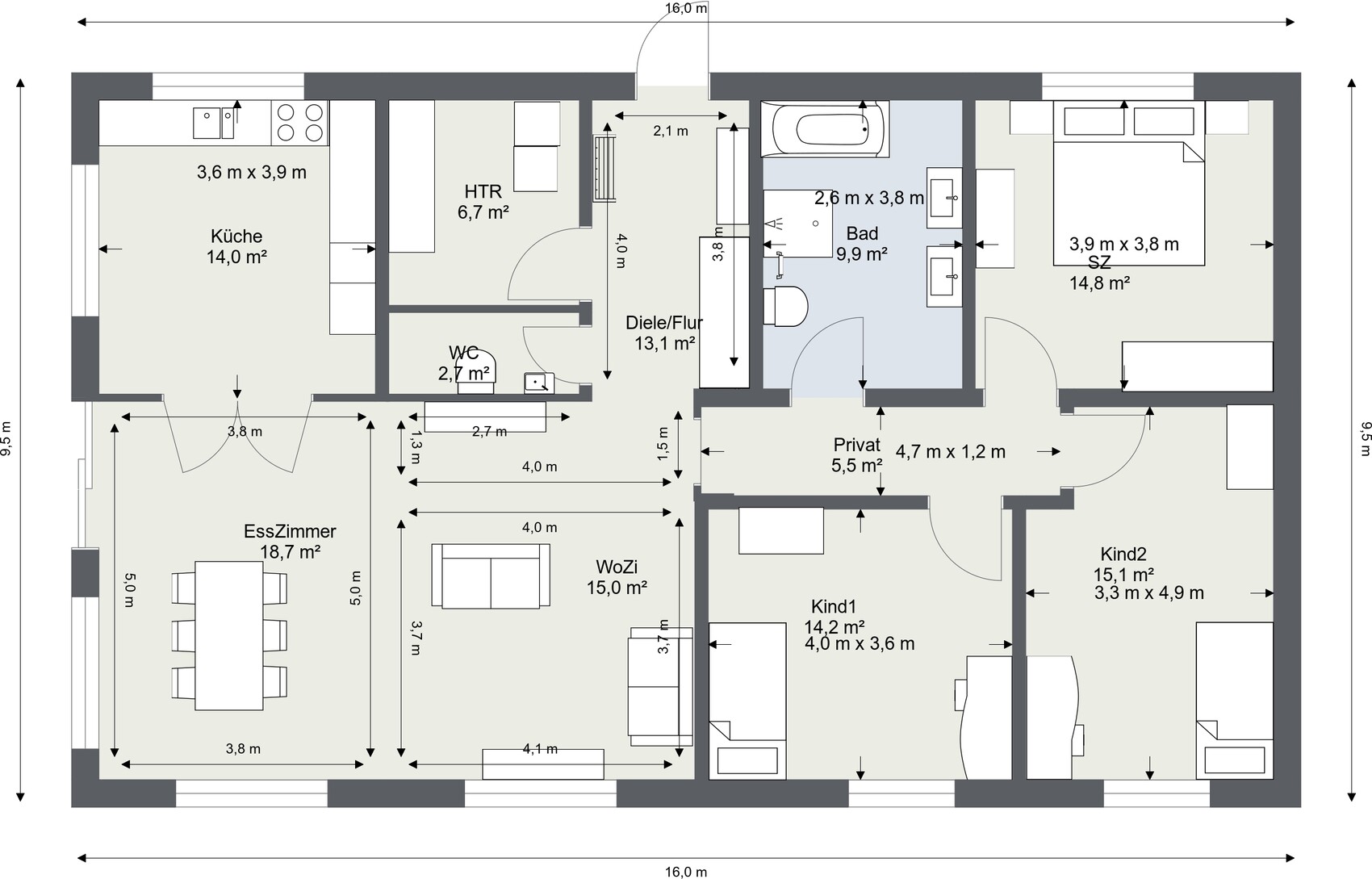 Ein dritter Fehler, den man vermeiden sollte, wird hier von Dir praktiziert: nämlich die geraden Außenkanten. Einerseits ist es zwar gut, an Ziererkern als Firlefanz zu sparen. Andererseits sind gerade verlaufende Außenwände in dogmatischer Dosierung aber ebenso ungünstig und führen ebenso wie beim "Quadrat aus Prinzip" dazu, Räume in für sie einzeln betrachtet ungünstige Breite-Tiefe-Verhältnisse zu zwingen, nur um in der Summe ein "klares Rechteck" zu erhalten. Dimensioniere doch testweise mal alle Räume "optimal" ungeachtet dessen, ob ihre Außenwände dann "in Linie" lägen.Es sind halt gewisse Vorgaben ( Verortung des Einfamilienhaus im Grundstück und Preis ) nach denen wir uns orientieren. Oder sehe ich die Mehrkosten zu kritisch? Letztendlich wir beim Mehrpreis vermutlich das Dach ausschlaggebend sein.