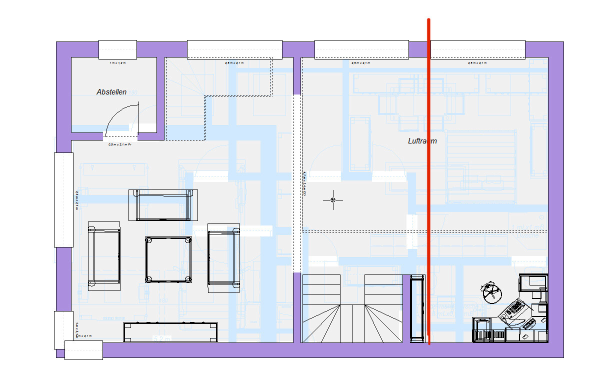 …es müsste die Wand im OG Wohnzimmer auf die Garagenwand verschoben werden, und die Wand zwischen Treppe und Arbeiten auf die darunter liegende Wand im EG Toilette verschoben werden.Das tut dem Wohnzimmer oben leider überhaupt nicht gut, befürchte ich.