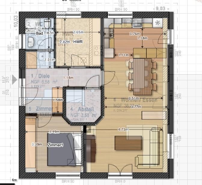 Küche und Essen ist lustlos ineinander verschachtelt ohne klare Zonierung. Kannst du näher erläutern, was daran doof ist? Mir erschien es gerade als Vorteil, bei einer offenen Küche den Esstisch in Alltag gleich anzuschließen. Er wird dann meistens auch kürzer sein. Bei größeren Gelagen können wir den Tisch ja problemlos weiter von der Küche wegtragen oder auch um 90 Grad drehen. Ist das alles falsch gedacht, und wenn ja, warum bzw. wie können wir es besser machen?