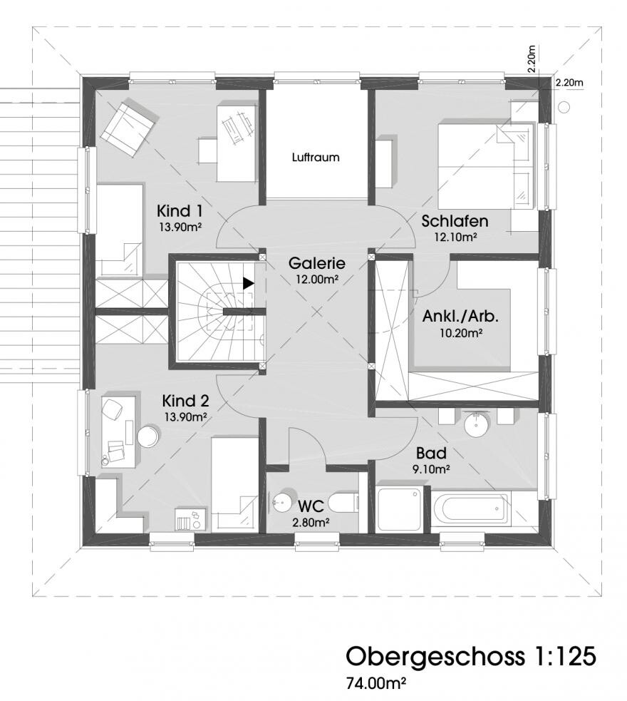 Gut gefällt mir hier das weniger enge Wohnzimmer, das größere Zimmer 1 und die größere Kleiderschrankstellfläche in den OG-Zimmern. Auch im Spitzboden hätte diese Anordnung aus meiner Sicht den Vorteil, das man den Abstellbereich links und rechts von der Treppe gestalten könnte und dann leichter ein davon abgegrenztes schön großes Zimmer in Spitzboden einrichten könnte.